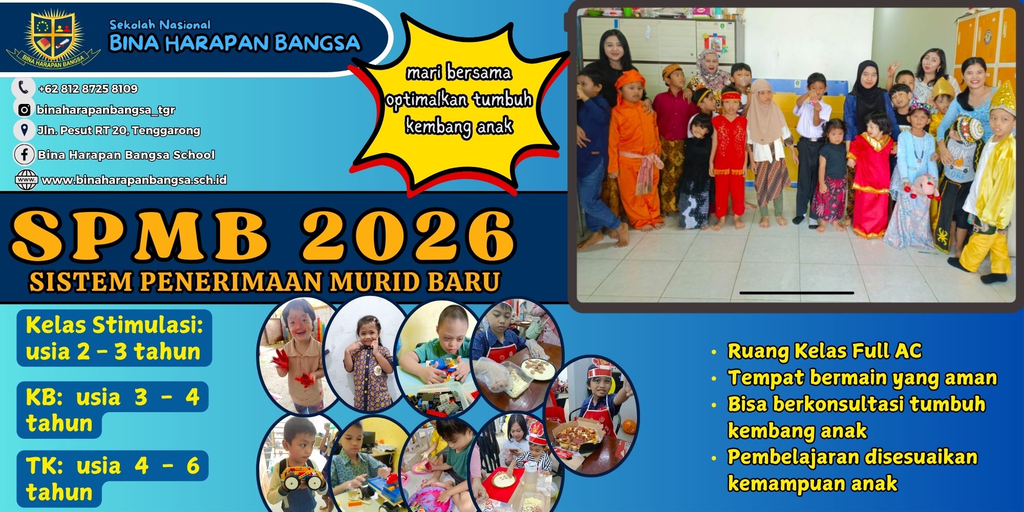 Sekolah BINA HARAPAN BANGSA, Tenggarong adalah sekolah umum dengan metode pembelajaran dan program yang sangat bagus dan tepat untuk perkembangan anak usia dini dan dasar. Sehingga keunikan setiap anak akan berkembang sesuai dengan tumbuh kembang usianya.